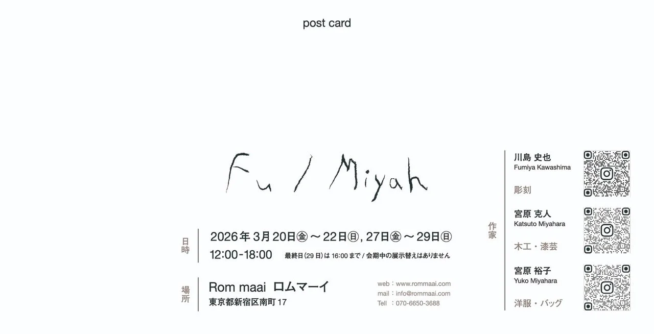 3月20日(金)- 3月22日(日)3月27日(金)- 3月29日(日)12:00-18:00 最終日16:00まで会場 Rom maai (ロムマーイ)東京都新宿区南町17